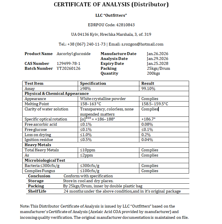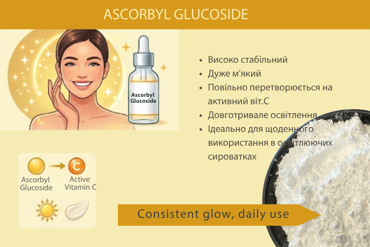 Аскорбіл Глюкозид є надзвичайно популярним у преміальній косметиці завдяки своїй здатності зберігати активність у широкому діапазоні pH та стійкості до окислення (він не темніє так швидко, як чиста аскорбінова кислота).